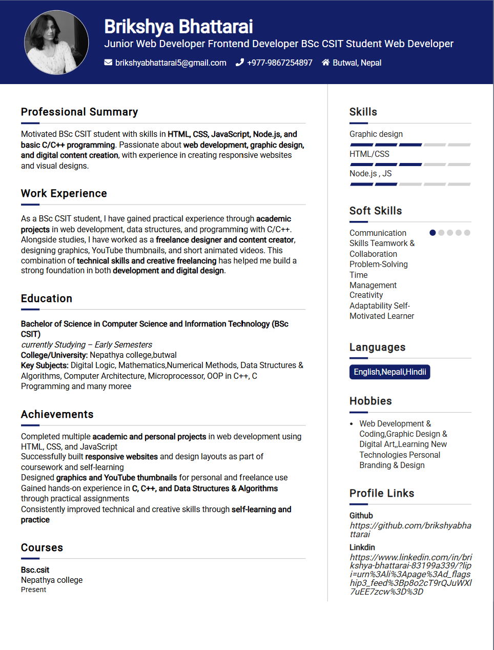 Hi, I'm Brikshya Bhattarai from Butwal-12,Rupendehi. A BSc CSIT student with skills in graphic design and web development. I design modern visuals and build responsive web applications using HTML, CSS, JavaScript, and Node.js. I am passionate about continuous learning and contributing to meaningful digital projects.